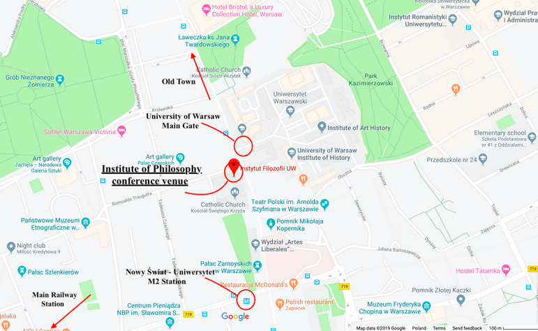 CONFERENCE VENUE3 Krakowskie Przedmieście Street, Institute of Philosophy buildingFrom Warsaw Central Railway Station (Warszawa Centralna) or City Station (Warszawa Śródmieście):by bus 128 or 175, get off at bus stop Uniwersytet.From the Chopin Airport:either take bus 175 and get off at bus stop Uniwersytet,or go by train: S2 to Warsaw City Station (Warszawa Śródmieście)or S3 to Warsaw Central Railway Station (Warszawa Centralna), then switch to bus or get a cab.From Warsaw-Modlin Airport:coaches to Warsaw City Center, Koleje Mazowieckie Trains to Warsaw Central Station, TAXI (fixed fares).Uber and Bolt cars should also be available there.From anywhere:buses - 116, 128, 175, 178, 180, 222, 102, 105, 111, 503, 518, E-2 - stop: Uniwersytet;Metro line M2, stop: Nowy Świat-Uniwersytet.PUBLIC TRANSPORT AND TAXIWarsaw has a very convenient public transportation system with two Metro linesand numerous bus and tram connections. Ticket fares can be checked here.If you plan to use the public transport in Warsaw, it may be convenient to purchase a 24 hour ticketwhich is valid on all public transport.The ticket entitles to unlimited number of journeys for 24 hours from its validation.Here are selected contact phones to TAXI companies that have reasonable prices:+48 666 00 96 68+48 22 646 46 46ACCOMMODATIONOrganizers do not provide accommodations.However, we have prepared a list of accommodation options near the conference venue.Other options can be looked for easily on booking.com.Hotel HARENDA (**)Hotel IBIS Stare Miasto (***)Hotel BRISTOL (*****)Hotel SOFITEL VICTORIA (*****)